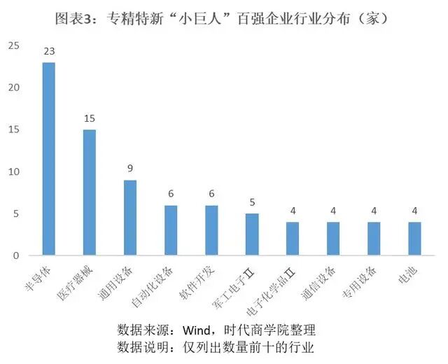 從行業(yè)分布來看,按申萬二級行業(yè)劃分,“小巨人”百強企業(yè)中,半導(dǎo)體企業(yè)數(shù)量顯著領(lǐng)先,達23家;醫(yī)療器械企業(yè)數(shù)量達15家,緊隨其后。 上述兩個行業(yè)屬于技術(shù)密集型行業(yè),備受資本市場青睞,在融資等方面獲得的支持力度較大,由此涌現(xiàn)大量優(yōu)秀的專精特新“小巨人”企業(yè)。 此外,通用設(shè)備、自動化設(shè)備、軟件開發(fā)等行業(yè)的“小巨人”百強企業(yè)數(shù)量也相對較多。