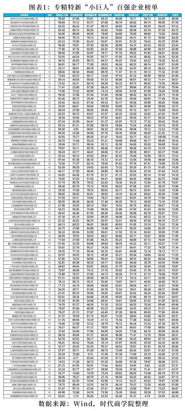 本文來源:時代商學(xué)院 作者:陳佳鑫 來源|時代商學(xué)院 作者|陳佳鑫 編輯|孫一鳴 專精特新“小巨人”企業(yè)通常在細(xì)分行業(yè)內(nèi)市場份額領(lǐng)先,且研發(fā)投入力度較大,具有“專業(yè)化、精細(xì)化、特色化、新穎化”特征,是我國產(chǎn)業(yè)創(chuàng)新升級的重要推動力。 2023年2月,工信部印發(fā)通知,組織開展第五批專精特新“小巨人”企業(yè)培育。工信部數(shù)據(jù)顯示,目前我國已培育8997家專精特新“小巨人”企業(yè)、848家制造業(yè)單項冠軍企業(yè)。 在近萬家的專精特新“小巨人”企業(yè)群體中,部分企業(yè)在創(chuàng)新、成長及盈利等方面表現(xiàn)尤為突出,時代商學(xué)院試圖通過構(gòu)建指標(biāo)體系,篩選出質(zhì)地優(yōu)異的專精特新“小巨人”企業(yè),以期洞察這些表現(xiàn)卓越的“小巨人”企業(yè)的特質(zhì)。 本文選擇全國知名度高的專精特新“小巨人”企業(yè)(以專精特新上市公司為主,加上部分知名專精特新非上市公司)作為樣本,從創(chuàng)新力、成長性、盈利能力、規(guī)模等方面進行綜合排名,并據(jù)此制作前100強企業(yè)榜單,如圖表1所示。